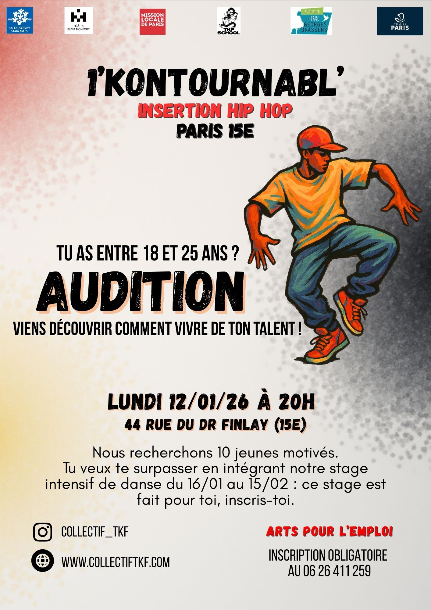 IMMERSION HIP HOP 1’KONTOURNABL’ Description : 1’Kontournabl’ est un programme immersif de 4 semaines d’enseignements artistiques et culturels porté par l’école des savoirs Hip Hop TKF School. Cette initiative innovante est conçue pour ouvrir de réelles perspectives de carrières dans le secteur artistique et culturel : -Danse (danseur Hip hop,assistant chorégraphe, intervenant en milieu scolaire…); -Arts visuels (graffeur, artiste urbain, designer graphique, performeur urbain); -Musique (rappeur, animateur d’ateliers Rap,beatmaker,DJ, assistant ingénieur son); -Communication et évènementiel (speaker,animateur radio,journaliste culturel,assistant organisateur d’évènements, chargé de production,assistant communication digitale) Au menu : -Danse Hip Hop -Rap -Graff -Echanges artistiques et culturels avec une compagnie de danseurs venus du Togo. Pré-requis : être âgé de 18 à 25 ans. Déroulement : Rdv à une audition le lundi 12/01/26 à 20 h pour présenter l’action 1’KONTOURNABL’. Inscription obligatoire au O6.26.41.12.59 Contact : Irène ou Jean-Paul Caf Finlay 44 rue du Dr Finlay 75015 Pilotes de l'événement : Emilie BERNARD Thématique : Préparation à l’emploi Dates : 12.01.2026 - 20:00 - 22:00 Adresse : 15e Arrondissement, Paris, France Fichier à télécharger 2025-TKFS-Dossier Formation 1K Paris 15.pdf Type : pdf Poids : 845.05 ko Télécharger Important pour les événements ouverts à inscription En vous inscrivant à cet événement, vous vous êtes engagé.e à y participer. Si vous êtes dans l'impossibilité de venir à ce rendez-vous, merci de vous désinscrire de l'événement via votre compte portail, ou de prévenir votre conseiller. Retour Inscrivez-vous à la Mission Locale de Paris Partager sur :