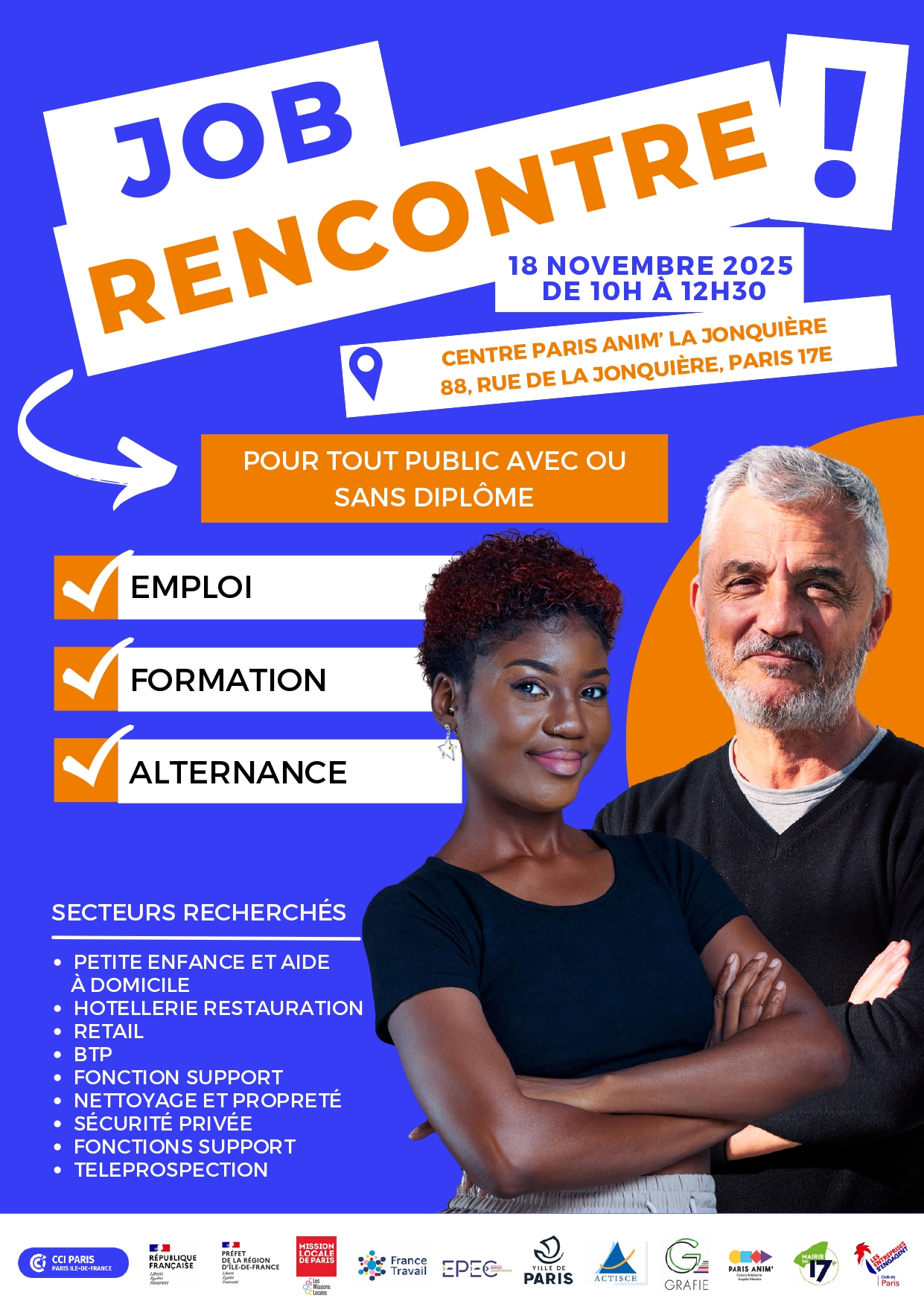 JOB RENCONTRE Description : 12 entités – 37 offres Thématique : Forum, Salon Domaine : Multi domaines Dates : 18.11.2025 - 10:00 - 12:30 Adresse : Centre Paris anim' La Jonquière 88, rue de la Jonquière, Paris 75017 Fichier à télécharger 2_A4_Affiche Job rencontre QPV_18_11_25_Paris 17.pdf Type : pdf Poids : 2.55 Mo Télécharger RECAP DES OFFRES Type : pdf Poids : 359.66 ko Télécharger Retour Inscrivez-vous à la Mission Locale de Paris Partager sur :