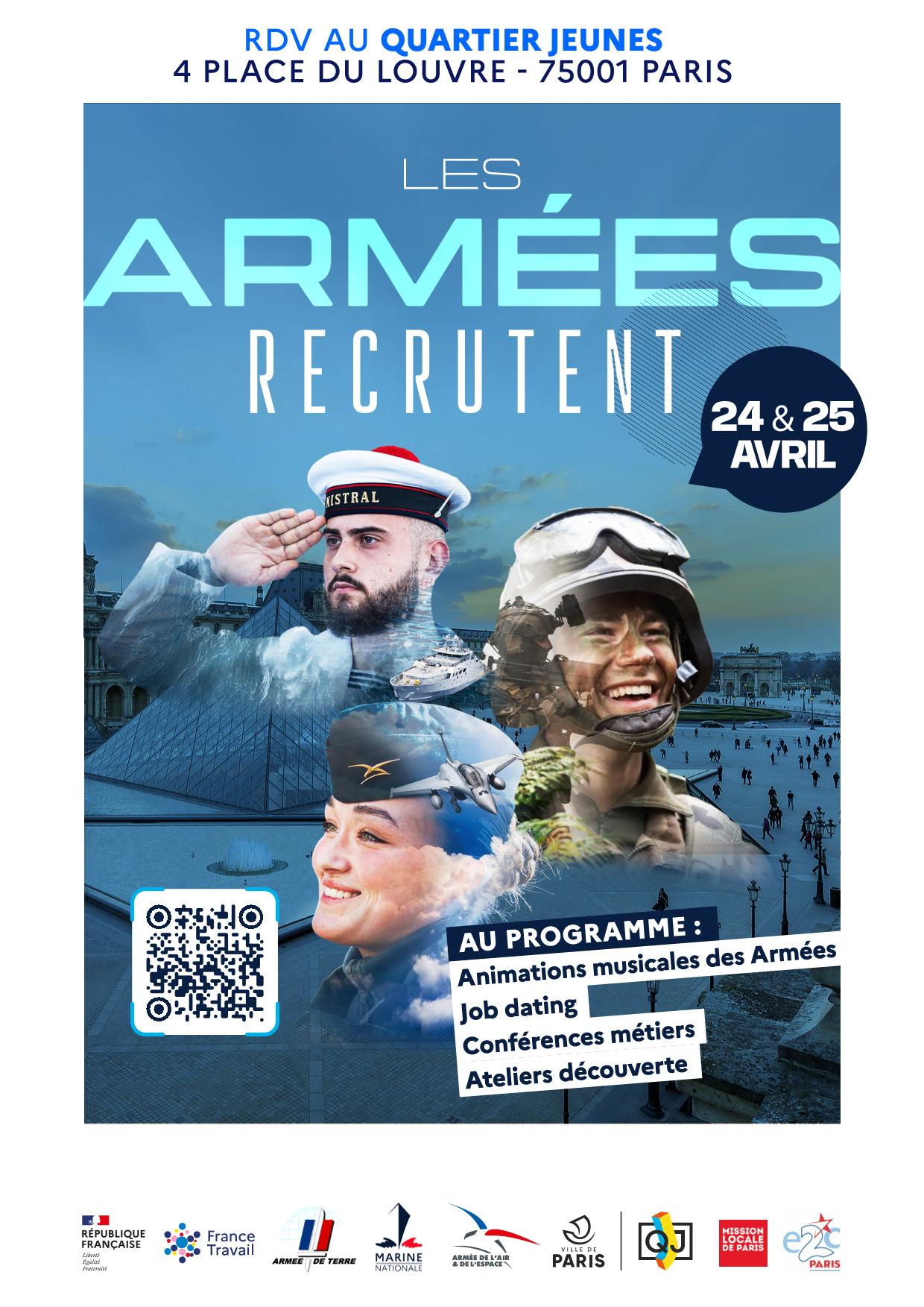 Les Armées recrutent à Paris Description : Le Centre d’Information et de Recrutement des Forces Armées de Paris (CIRFA) vous invite aux journées portes ouvertes d’information et de recrutement. Lors de ces journées informatives, interactives et sportives (tir laser, simulateurs hélicoptère, etc…), vous pourrez échanger avec les militaires présents et découvrir des métiers, des formations et les possibilités d’évolution professionnelle et humaine dans l’Armée de Terre, la Marine Nationale et l’Armée de l’Air et de l’Espace. L’entrée est libre et accessible à toutes et à tous dès 18 ans et sans condition de diplôme. 📍 Rendez-vous à Quartier Jeunes ! 4 place du Louvre, 75001 Paris 📅 Les 24 et 25 avril 2026 ⏰ De 10h à 18h Déroulement : Au programme de ces journées : Trois conférences métiers (offres jeunesse et carrière – le service National – la réserve) Un job dating en continu Des atliers découvertes proposant des activités interactives Des animations musicales. Nous vous invitons à scanner le QR Code sur l’affiche en pièce jointe pour connaitre le programme et les horaires. Thématique : Information métiers Domaine : Multi domaines Dates : 24.04.2026 - 10:00 / 25.04.2026 - 18:00 Adresse : 4 Place du Louvre, Paris, France Fichier à télécharger Les Armées recrutent à Paris - 24 et 25 04 2026.jpg Type : jpg Poids : 258.67 ko Télécharger Retour Inscrivez-vous à la Mission Locale de Paris Partager sur :