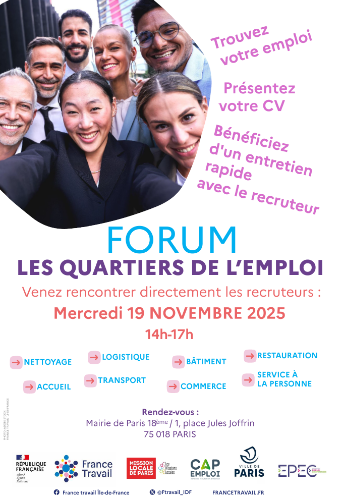 Les quartiers de l’emploi Description : La Mission Locale, avec les agences France Travail du 18eme arrondissement (Genevoix et Ney) et l’EPEC organisent le forum « les quartiers de l’emploi » le mercredi 19 novembre 2025 à la mairie du 18eme de 14h à 17h (1 place Jules Joffrin, 75018 – Metro Ligne 12 ”Jules Joffrin”). Venez échanger en direct avec les recruteursavec et déposer vos CV ! Déroulement : Nombreuses entreprises présentes. Fonctions représentées : 1. AGENT / AGENTE DE PROPRETÉ DE LOCAUX 2. CHARGÉ / CHARGÉE D’ACCUEIL 3. VENDEUR / VENDEUSE EN PRÊT-À-PORTER 4. EMPLOYÉ / EMPLOYÉE DE LIBRE-SERVICE 5. PRÉPARATEUR / PRÉPARATRICE DE COMMANDES 6. MÉTIERS DE SERVICES À LA PERSONNE 7. MÉTIERS DE LA RESTAURATION 8. MÉTIERS DE LA CONSTRUCTION BTP Pilotes de l'événement : Mathieu HUE Thématique : Recrutement Domaine : Multi domaines Dates : 19.11.2025 - 14:00 - 17:00 Adresse : Mairie du 18ème arrondissement, 1 place Jules Joffrin, 75018). Important pour les événements ouverts à inscription En vous inscrivant à cet événement, vous vous êtes engagé.e à y participer. Si vous êtes dans l'impossibilité de venir à ce rendez-vous, merci de vous désinscrire de l'événement via votre compte portail, ou de prévenir votre conseiller. Retour Inscrivez-vous à la Mission Locale de Paris Partager sur :