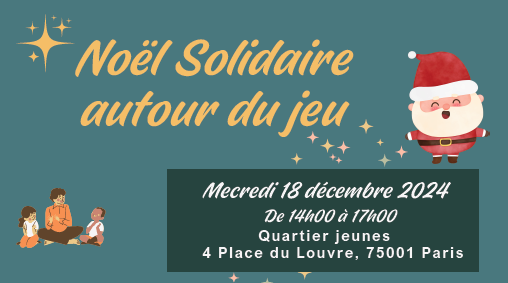 NOËL SOLIDAIRE : AUTOUR DU JEU Description : Cet événement s’adresse à tous les jeunes qui ont des enfants ou des petits frères/petites soeurs âgé(e)s de 1 à 10 ans. Inscrivez vous vite pour venir avec votre ou vos enfants sur le portail ! https://www.missionlocale.paris/espace-salarie/mon-espace/planning-des-activites/?ID=909837 Déroulement : Au programme : *Des Stands de jeux libres et/ou encadrés par la ludothèque Nautilude ainsi que des bénévoles de la MLP *Un Goûter sera également offert en fin d’après midi *Un Temps d’écoute sera proposé aux parents tout au long de l’après-midi. Participants : Thématique : Citoyenneté et Loisirs / Culture / Sport Dates : 18.12.2024 - 14:00 - 17:00 Adresse : 4 Place du Louvre, Paris, France Fichier à télécharger Affiche noel solidaire MLP 2024 v2.pdf Type : pdf Poids : 926.01 ko Télécharger Important pour les événements ouverts à inscription En vous inscrivant à cet événement, vous vous êtes engagé.e à y participer. Si vous êtes dans l'impossibilité de venir à ce rendez-vous, merci de vous désinscrire de l'événement via votre compte portail, ou de prévenir votre conseiller. Retour Inscrivez-vous à la Mission Locale de Paris Partager sur :