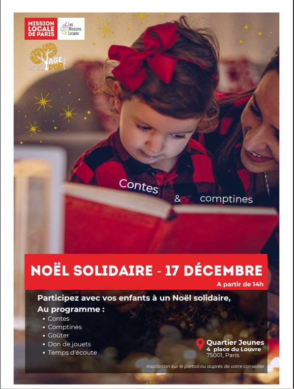 Noël Solidaire Mercredi 17 Décembre à 14H – Quartiers jeunes Description : La mission locale organise son Noël solidaire ! Tu es jeune parent ? Viens profiter d’instants de détente et de solidarité avec ton ou tes bouts de chou !! ->s’inscrire : https://www.missionlocale.paris/espace-salarie/mon-espace/planning-des-activites/?ID=930767 Disponible pour co-animer les activités avec nous ? *Info coll : explications sur les animations et l’organisation https://www.missionlocale.paris/espace-salarie/mon-espace/planning-des-activites/?ID=930177 *Répétition et coordination des activités : https://www.missionlocale.paris/espace-salarie/mon-espace/planning-des-activites/?ID=930807 Déroulement : Au programme : Contes et comptines Gouter Don de jouets Temps d’écoute…. et que de la bonne humeur…!! Participants : Natacha MALATRAS Thématique : Loisirs / Culture / Sport Dates : 17.12.2025 - 14:00 - 17:00 Adresse : 4 Place du Louvre, Paris, France Important pour les événements ouverts à inscription En vous inscrivant à cet événement, vous vous êtes engagé.e à y participer. Si vous êtes dans l'impossibilité de venir à ce rendez-vous, merci de vous désinscrire de l'événement via votre compte portail, ou de prévenir votre conseiller. Retour Inscrivez-vous à la Mission Locale de Paris Partager sur :