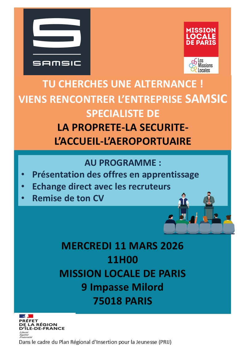 Rencontre ENTREPRISE SAMSIC – Découverte des métiers de l’AEROPORTUAIRE-ACCUEIL-SECURITE-PROPRETE Description : Rencontre avec l’entreprise SAMSIC, leader sur le marché des services aux entreprises. Deux salariés du groupe en charge de l’alternance viendront présenter les métiers et ses missions accessibles en apprentissage dans les secteurs de l’Aéroportuaire, l’Accueil, la Sécurité et la Propreté. Ils présenteront également les opportunités d’emploi en apprentissage et les profils recherchés. C’est une occasion unique de rencontrer un grand groupe, de mieux comprendre ses métiers et trouver peut-être une alternance! Pour les jeunes intéressés, SAMSIC propose également d’organiser des visites de chantiers afin qu’ils puissent découvrir les environnements de travail et les réalités du terrain. Déroulement : – Présentation du groupe SAMSIC – Présentation des secteurs d’activités – Présentation des métiers accessibles en apprentissage – Présentation des profils recherchés et des offres en apprentissage – Temps d’échange avec les chargés de l’alternance Thématique : Alternance et Information métiers Domaine : Multi domaines, Santé, et Services à la personne et à la collectivité Dates : 11.03.2026 - 11:00 - 12:30 Adresse : MISSION LOCALE Site MILORD-9 Impasse Milord 75018 PARIS Important pour les événements ouverts à inscription En vous inscrivant à cet événement, vous vous êtes engagé.e à y participer. Si vous êtes dans l'impossibilité de venir à ce rendez-vous, merci de vous désinscrire de l'événement via votre compte portail, ou de prévenir votre conseiller. Retour Inscrivez-vous à la Mission Locale de Paris Partager sur :