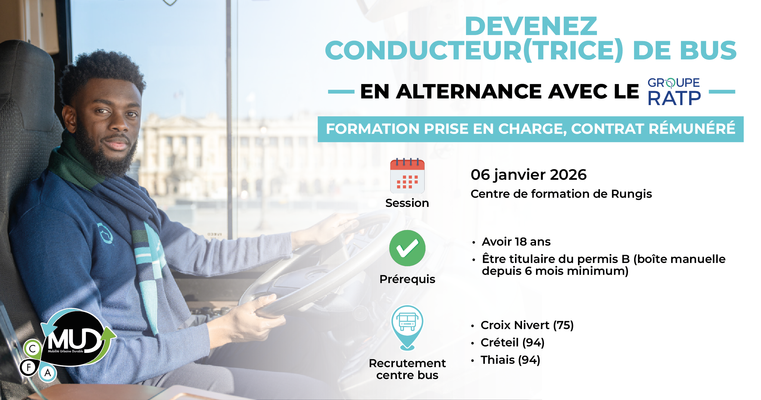CONDUCTEUR DE BUS CONTRAT D’APPRENTISSAGE (H/F) RÉFÉRENCE : N°AM6657059 Description de l'offre : Le CFA MUD recrute des Conducteurs de bus en contrat d’apprentissage d’une durée de 6 mois. Préparer, former à : – Assurer une mission commerciale important auprès de la clientèle – Être responsable des personnes à bord du bus ainsi que du véhicule tout en veillant à la sécurité et au respect de la réglementation. Thématique : Recrutement Domaine : Transport et Logistique Type de contrat : Contrat d'apprentissage Offre valide jusqu'au : 31 décembre 2025 Prérequis : Etre âgée d’au moins 21 ans, Etre titulaire du permis B (boîte manuelle) et posséder un moyen de transport personnel. Maximum niveau Bac +2 – Contact : – Si vous êtes INSCRIT.E A LA MISSION LOCALE DE PARIS : Cliquez sur le bouton “Me positionner sur l’offre” pour poser votre candidature. Enregistrez ensuite CV A JOUR ET ADAPTE dans votre coffre-fort en le nommant ” CONDUCTEUR DE BUS EN APPRENTISSAGE” – Si vous n’avez PAS ENCORE ACTIVE VOTRE COMPTE, ou que le bouton “Me positionner sur l’offre” n’apparaît pas, contactez votre conseiller. – Si vous n’êtes PAS INSCRIT.E A LA MISSION LOCALE DE PARIS, inscrivez-vous : Pré-inscription Mission Locale de Paris Fichier à télécharger CONDUCTEUR DE BUS en alternance 06.01.26.png Type : png Poids : 1.60 Mo Télécharger Retour Inscrivez-vous à la Mission Locale de Paris Partager sur :